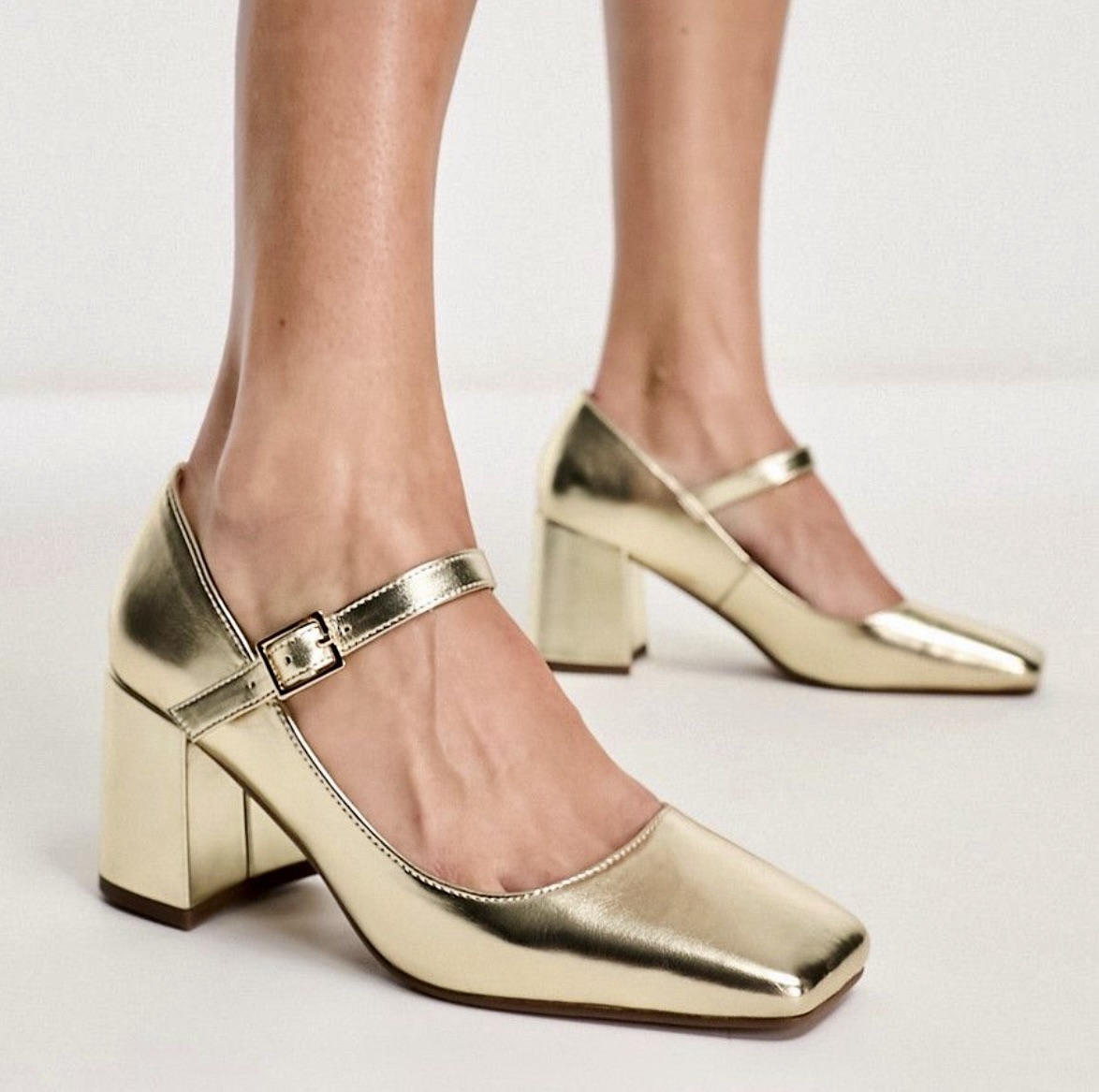 Festive shoes, gold-coloured, with a reasonably high heel, a nice strap & a slightly wide front to avoid pinched toes. Gorgeous!