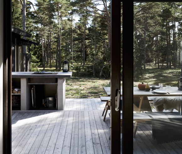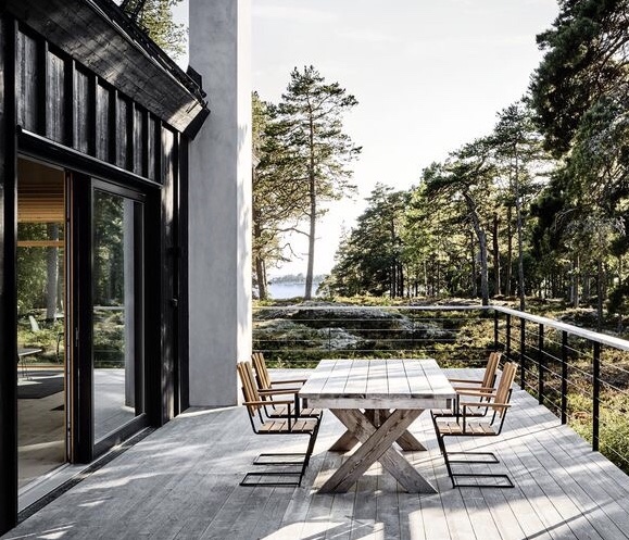 Dreamy summer residence on a pier with a house that is simply designed without frills, straightforward, in black wood with large open spaces – and a lovely dock to use as extra space for various activities.