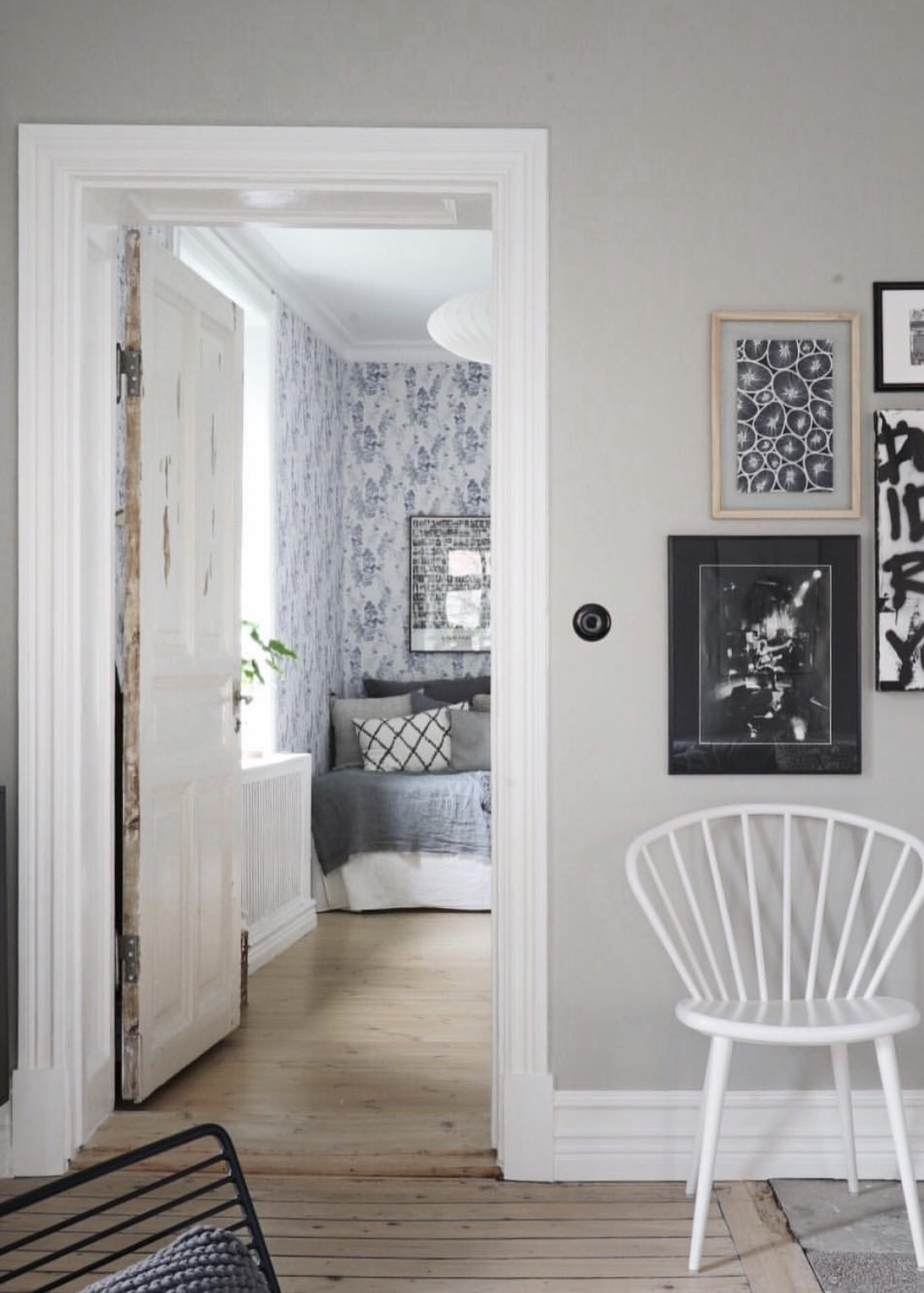 The typical features to make home personal & sweet. In this case, untreated wooden floor, light wall colours, patterned wall paper, textiles & framed art.