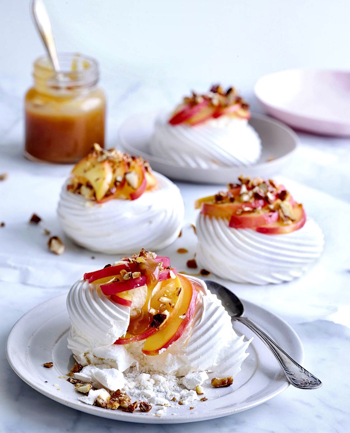 Pavlova, incredibly sweet pastries, like tiny jewelleries on the plate. A variant filled with mascarpone cream, fried apple, sweet salt caramel sauce & candied almonds. Perfect size & an opportunity for upcoming Easter holiday.