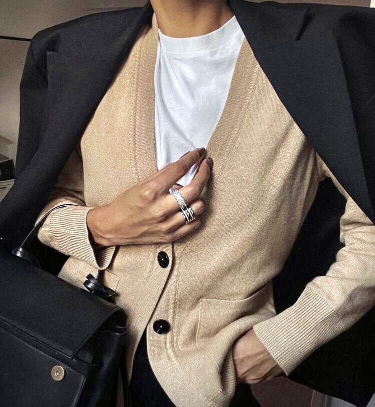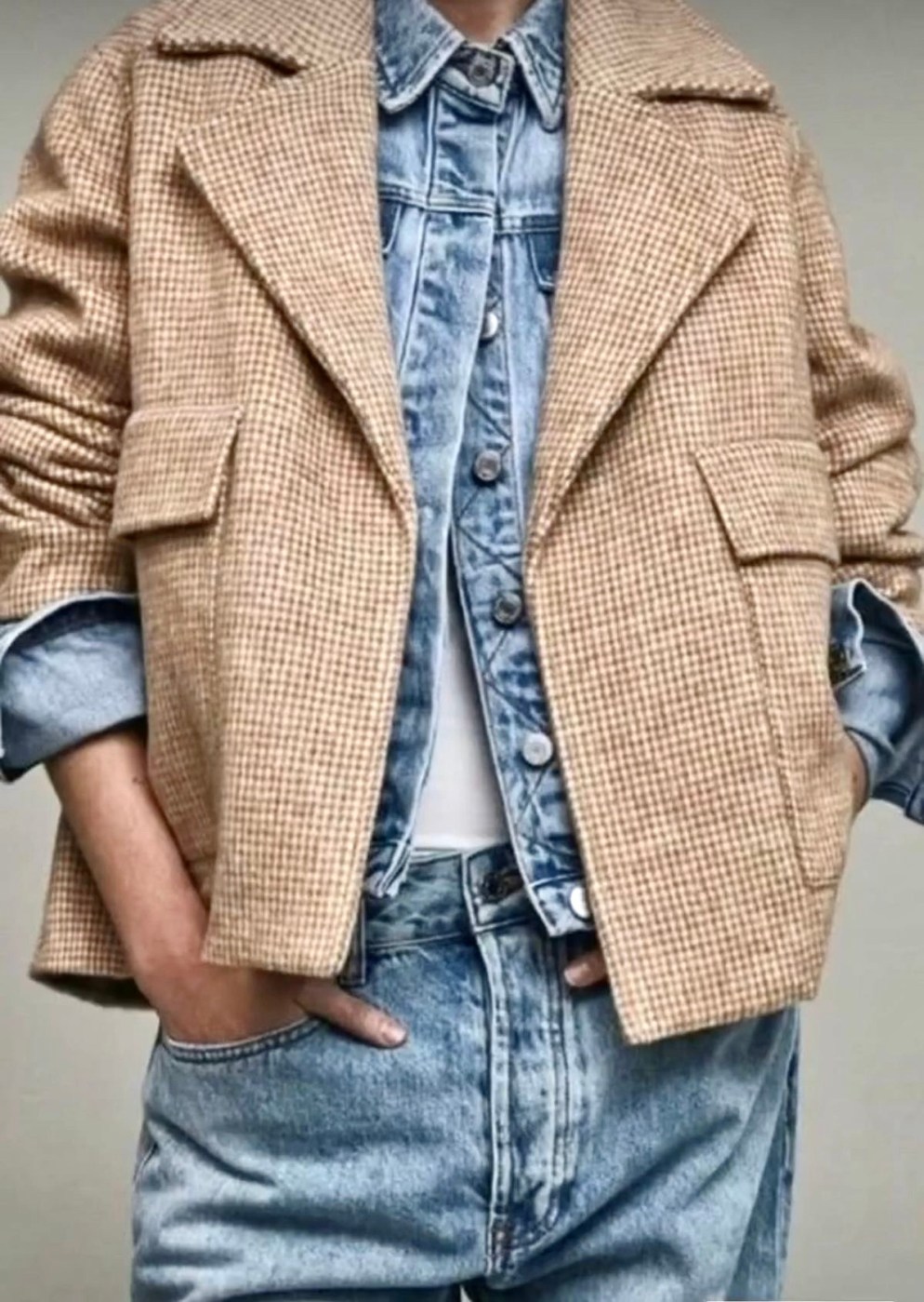 Long loose blazer, wide white pants, blue shirt & a t-shirt – a stylish combination, especially when you add stripes.