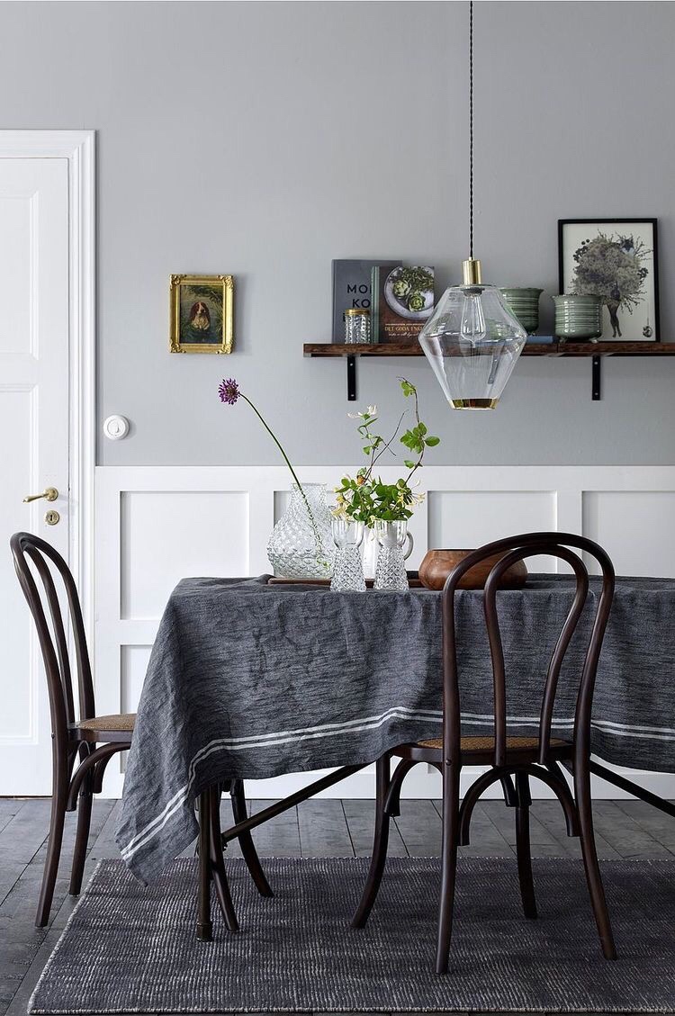 Nice table setting with a dark-toned color scheme, suitable for an evening at home. Great in gray & white – and crystal, candelabra and warm sheepskin.